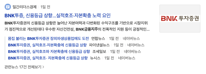 2021년 2월 4일 일간리더스경제 BNK투증, 신용등급 상향... 실적호조,자본확충 노력요인이라는 기사제목을 볼 수 있습니다.