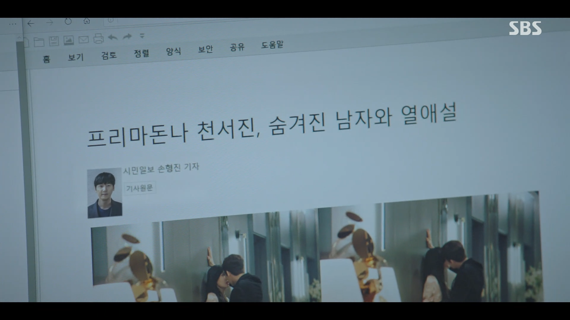 한편 급히 회사로 오라고 말합니다. 천서진은 주단태의 사무실로 갔는데 주단태 회장과의 불화설! 파혼설! 이대로 결혼은 무산되나 그리고 프리마돈나 천서진, 숨겨진 남자와 열애설 이라는 두가지 기사를 올리기전 주단태에게 보낸듯 합니다. 작성한 기자는 앞전에 성대결절관련 기사를 쓴 손형진 기자입니다.