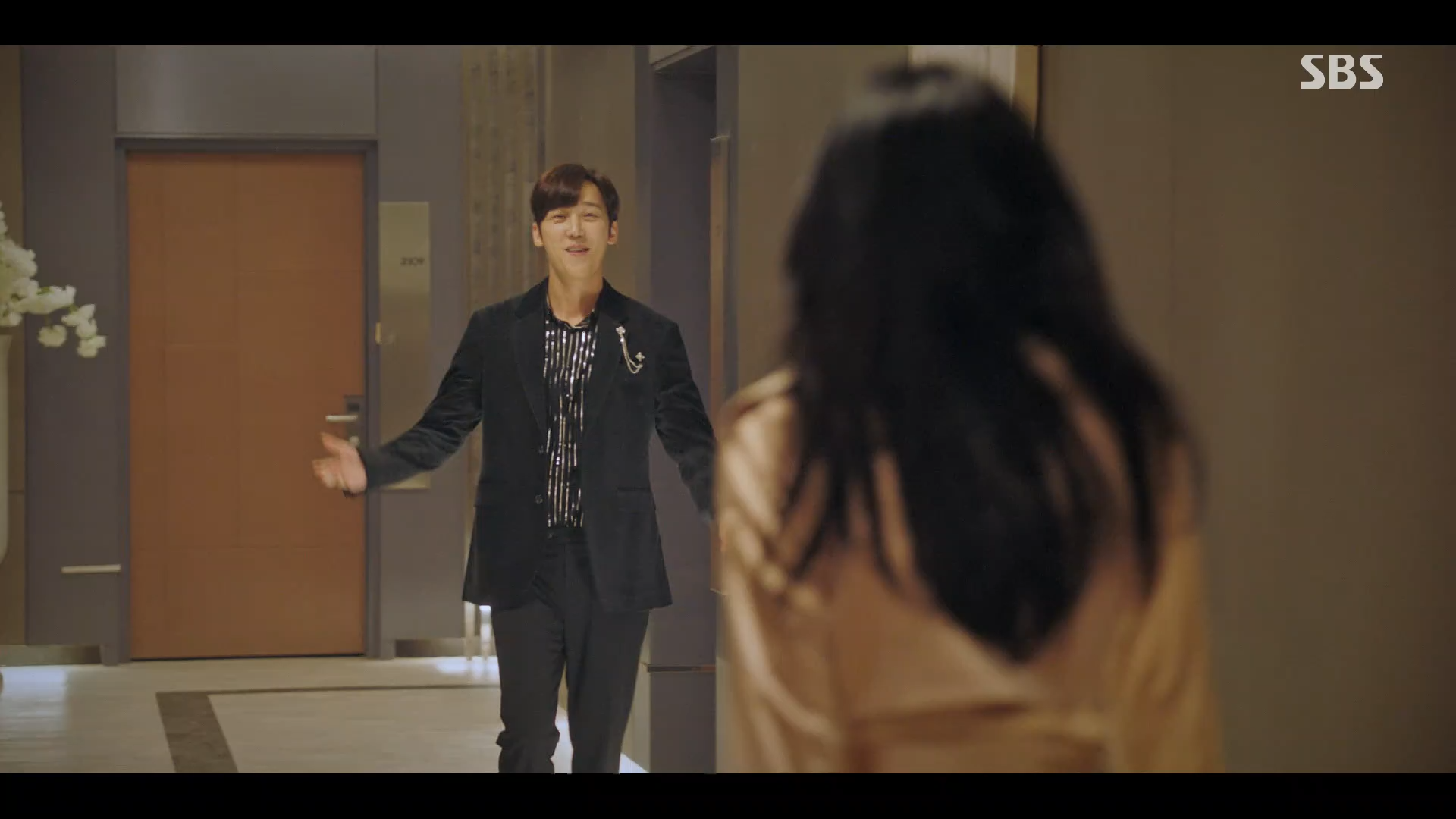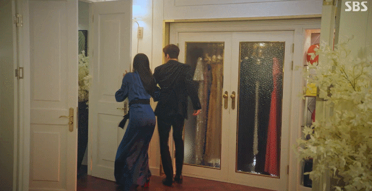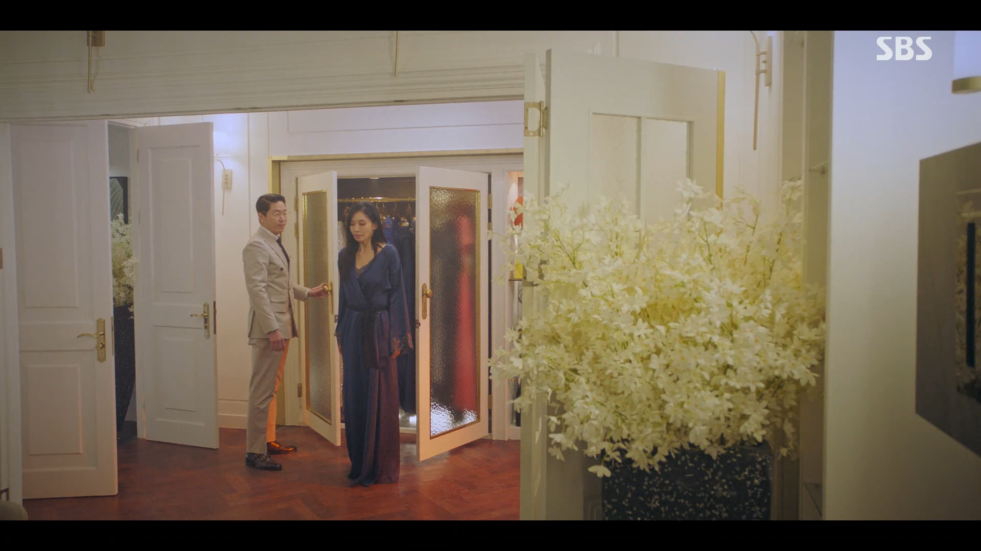 천서진은 상냥하게 고맙다고 하는데 주단태는 서프라이즈가 있다고 말하며 하윤철이 숨어 있는 드레스룸을 열어서 드레스 몇벌을 준비 했다고 말합니다.