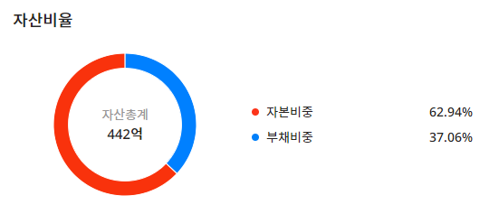 자산총계 : 442억, 자본비중 : 62.94%, 부채비중 : 37.06% 로 구성이 되어 있으며
