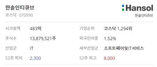 이번 시간은 한솔인티큐브(070590)종목에 대해서 알아보는 시간을 가져보려고 합니다.