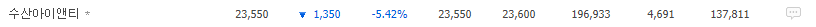 하락 1위는 수산아이앤티(050960) -5.42% 입니다.