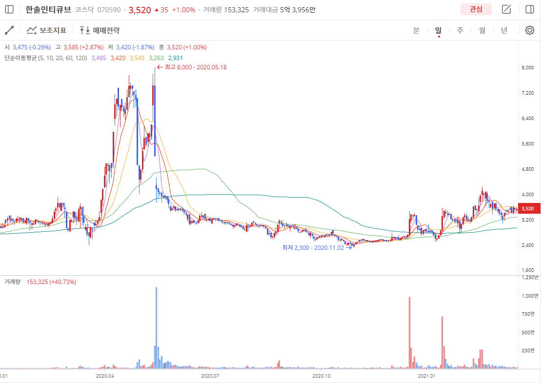 한솔인티큐브(070590)는 2020년 5월 18일 52주 고점 8,000원을 찍고 2020년 11월 2일 52주 저점 2,300원을 찍고 2021년 3월 22일 종가 3,520원에 끝났습니다.