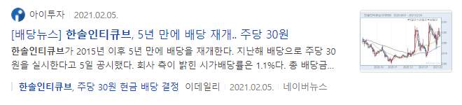 배당뉴스 한솔이티큐브 5년 만에 배당 재개 주당 30원 이라는 기사제목을 볼 수 있는데 2015년 이후 5년만에 배당을 재개한다는 내용은 위에 공시 부분과 같은 내용입니다.