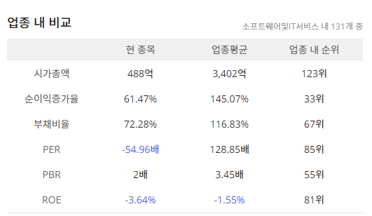 세부산업군 : 소프트웨어및IT서비스 내 131개 중 업중 내 시가총액 순위는 123위(483억)입니다.