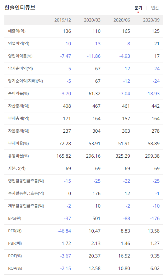 한솔인티큐브(070590)는 2020년 9월 전년동기 대비 별도기준 매출액은 12% 감소했고 영업손실은 356.8% 증가하였고 당기순이익 흑자전환했습니다.