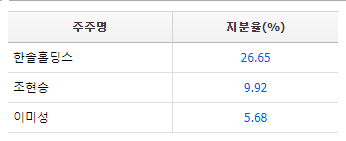 한솔인티큐브(070590)의 대주주 현황은 한솔홀딩스(외 2인) 42.25%이며 한솔홀딩스 26.65% 입니다.