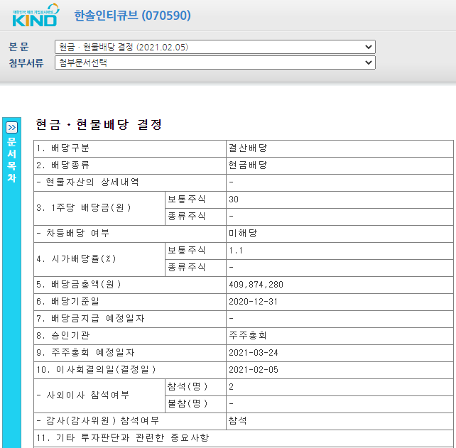 한솔인티큐브(070590)는 배당금을 주는 종목이기 때문에 2021년 배당금 관련 공시를 가져왔습니다.