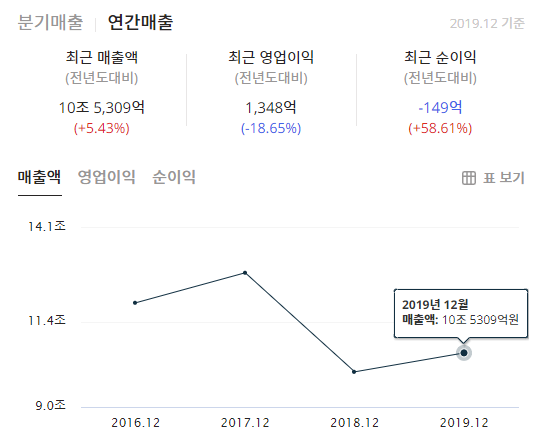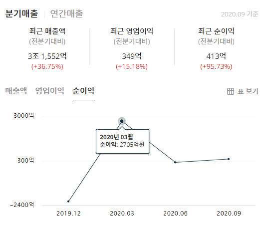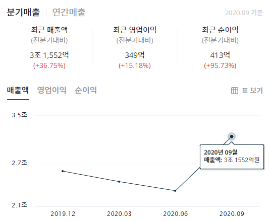 2020년 9월 매출액은 3조 1552억원, 2019년 12월 기준 연간매출액 10조 5309억원입니다.