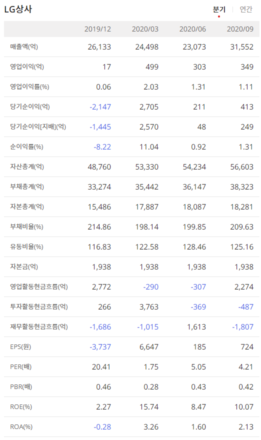 LG상사(001120)의 분기매출과 연간매출을 확인해 보겠습니다.