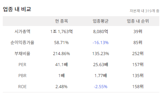 LG상사(001120)의 세부산업군 기준 자본재 내 319개 중 업종 내 시가총액 39위(1조 1,763억)이며 ROE : 158위 , PER : 157위 입니다.