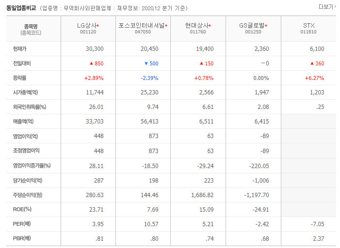 LG상사(001120)의 WICS : 무역회사와판매업체 동일업종은 포스코인터내셔널(047050), 현대상사(011760), GS글로벌(001205), STX(011810)이 먼저 보입니다.