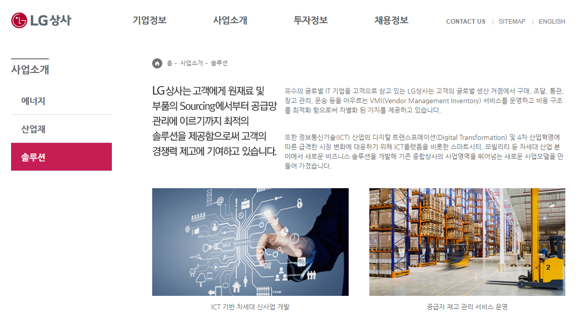 LG상사(001120)의 솔류션 부분은 고객에게 원재료 및 부품 소싱에서부터 공급망 관리에 이르기까지 최적의 솔루션을 제공함으로써 고객의 경쟁력 제고에 기여하고 있다고 하며 VMI(Vendor Management Inventory)서비스를 운영하여 비용 구조를 최적화 하고 정보통신기술(ICT) 산업에 디지털 틀랜스포메이션 및 4차 산업혁명에 따른 급격한 시장 변화에 대응하기 위해 ICT플랫폼을 비롯한 스마트시티, 모빌리티 등 차세대 산업 분야에서 새로운 비즈니스 솔루션을 개발해 기존 종합상사의 사업영역을 뛰어넘는 새로운 사업모델을 만들어가겠다고 합니다.
