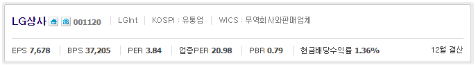 LG상사(001120) 코스피 : 유통업 , WICS : 무역회사와판매업체 , EPS : 7,678 , BPS : 37,205 , PEB : 3.84 , 업종PER : 20.98 , PBR : 0.79 , 현금배당수익률 : 1.36% , 산업군 : 산업재 , 세부산업군 : 자본재 입니다.