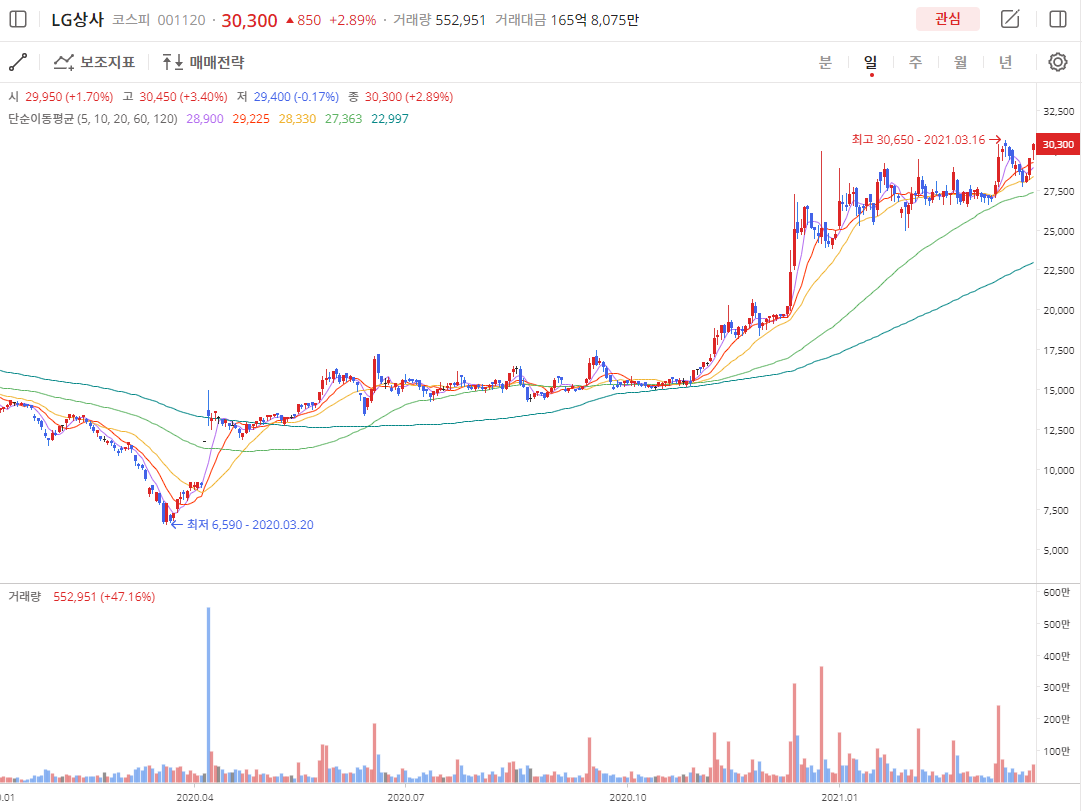 LG상사는 COVID-19저점 52주 저점 2020년 3월 20일 저점 6,590원을 찍고 52주 고점 2021년 3월 16일 30,650원을 찍고 2021년 3월 26일 30,300원에 장을 마감했습니다. 고점 근처까지 온 상태에서 장을 마감했습니다.