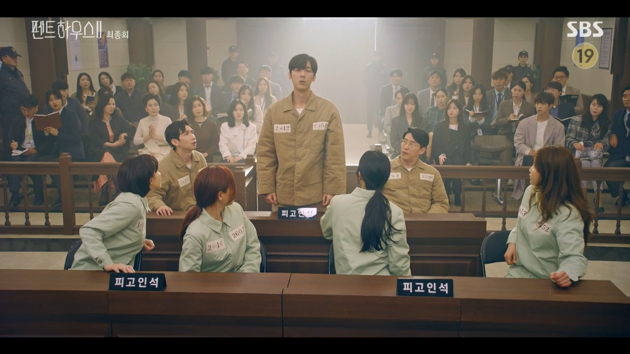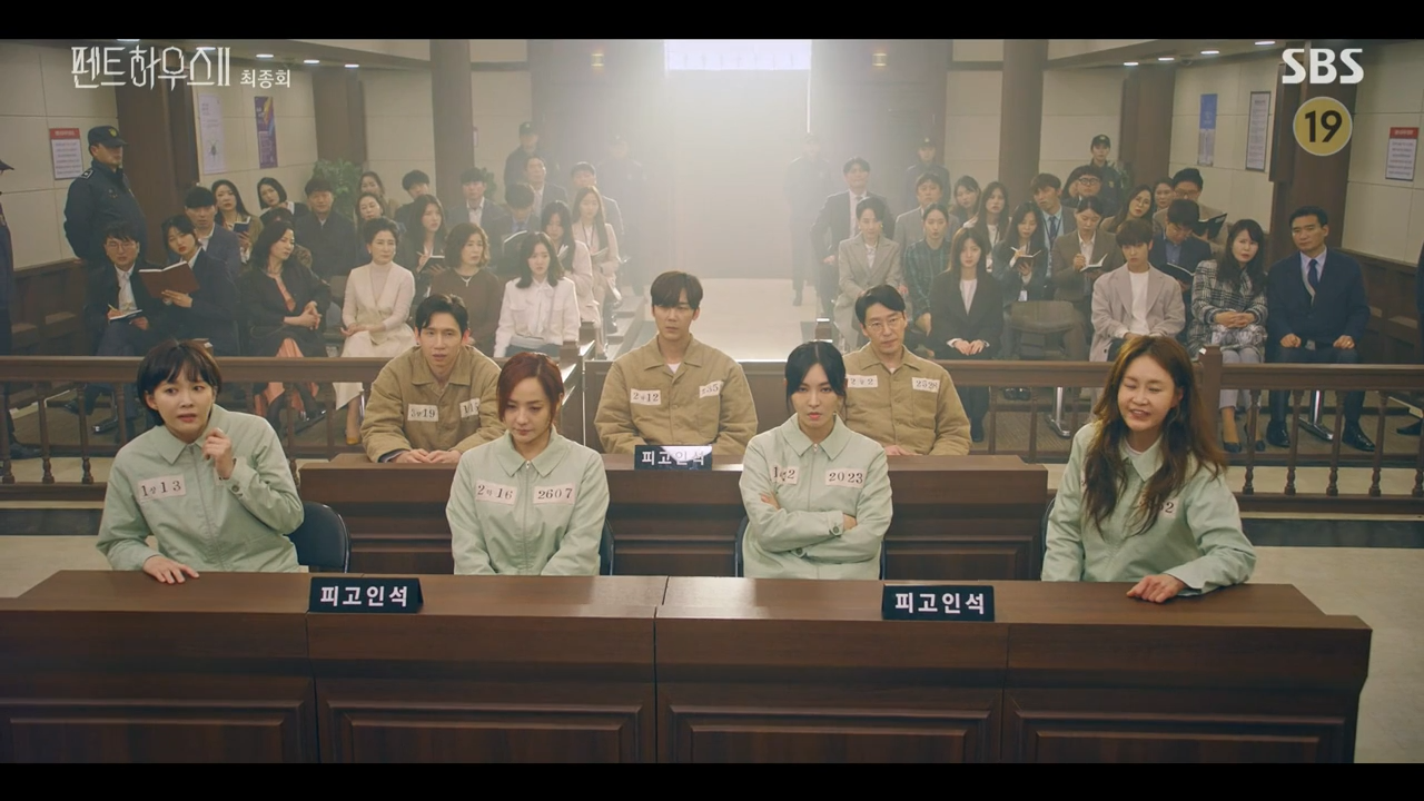 피고인석에 있는 이규진, 주단태, 고상아, 천서진, 강마리는 죄는 오윤희한테 있다며 자기들은 잘 못이 없다고 말합니다.