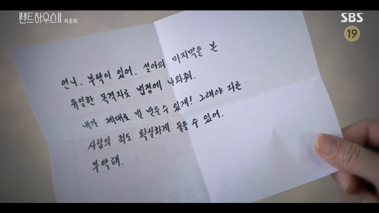 1부에서 로나가 살아있다는 것을 알게된 그날 오윤희는 심수련에게 쪽지를 보내고 그 쪽지 안에는 언니. 부탁이 있어. 설아의 마지막을 본 유일한 목격자로 법정에 나와줘. 내가 제대로 벌 받을 수 있게! 그래야 다른 사람의 죄도 확실하게 물을 수 있어. 부탁해 라는 내용이 있었습니다.