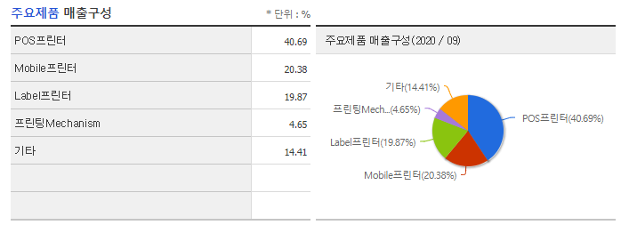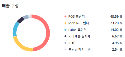 매출구성은 POS 프린터 : 48.79%, MOBILE 프린터 : 23.20%, LABEL 프린터 : 14.02%, 기타제품 원자재 : 6.67%, 기타 : 4.98%, 프린팅 매커니즘 : 2.54%로 구성이 되어있습니다.