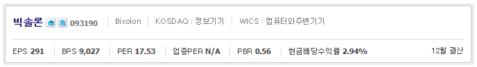 빅솔론(093190)은 코스닥 : 정보기기, WICS : 컴퓨터와주변기기, EPS : 291, BPS : 9,027, PER : 17.53, 업종PER : N/A, PBR : 0.56, 현금배당수익률 2.94%, 산업군 : IT, 세부산업군 : 하드웨어및IT장비 입니다.