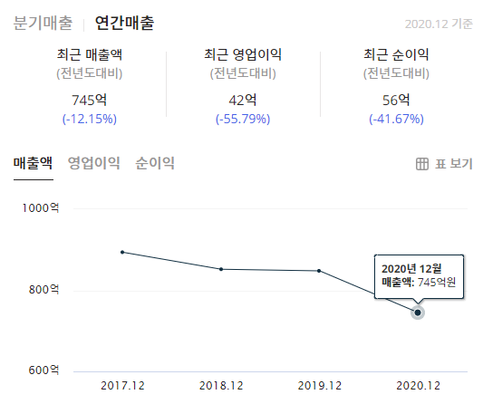 위에서 언급한것처럼 매출액이 2020년도에는 소폭 감소를 한것이 보이며 영업이익과 순이익이 줄어들고 있는것을 볼 수 있습니다.