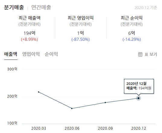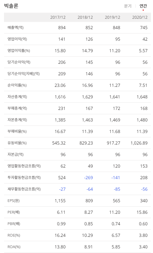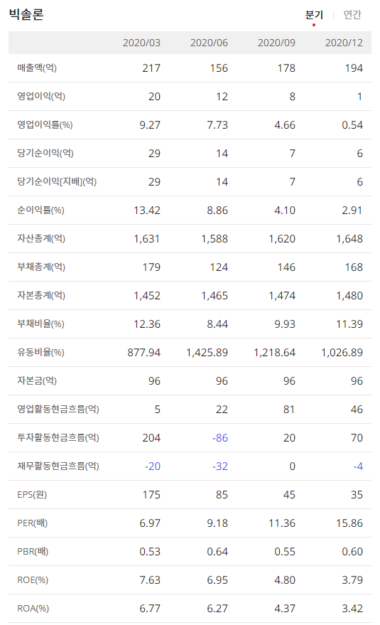 이제 빅솔론(093190)의 분기매출과 연간매출 그리고 자세한 재무정보를 확인해보겠습니다.