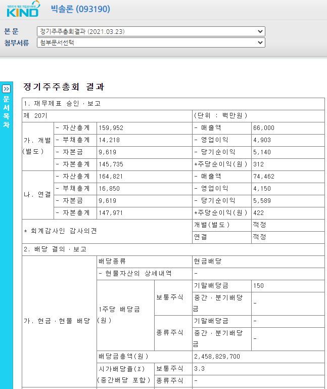 2021년 3월 23일 공시이며 정기주주총회 결과 1주당 배당금은 150원입니다. 시가배당율은 3.3%입니다.