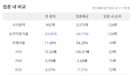 그리고 WICS 분류 기준인 컴퓨터와주변기기로 동일업종은 에이텍(045660), 앱코(129890), 에이텍티앤(224110), 케이씨티(089150)이 보이며 관련 업종종목은 총 22개가 있으며 2021년 4월 5일 기준으로 전일대비 +0.72%로 정규장을 마감했습니다.