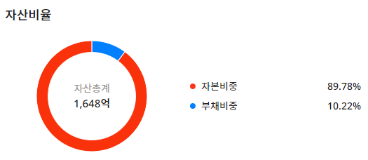 자산비율은 자산총계 : 1,648억이며 자본비중은 : 89.78%, 부채비중 : 10.22%로 구성되어 있으며