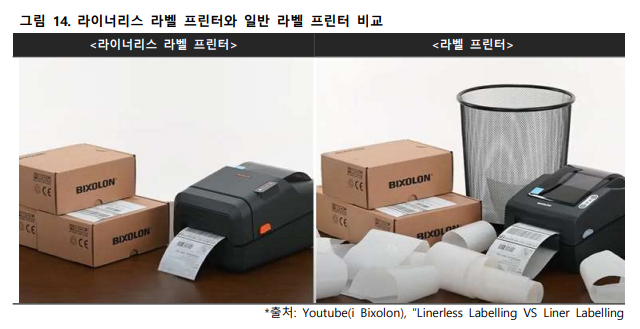 그리고 빅솔론은 라이너리스 라벨 프린터를 개발해서 뒷면의 이형지가 없어 발생되는 쓰레기가 없고 일반 라벨지 보다 40% 많은 라벨 인쇄가 가능하여 유지비용 절감 효과가 있으며 이형지를 떼어내는 시간을 단축할 수 있어 향후 라이너리스 라벨 프린터에 대한 수요가 증가할 것으로 전망한다고 합니다.