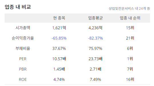 시공테크(020710)의 세부산업군:산업및전문서비스 내 24개 중 시가총액 15위(1,621억)이며 ROE:16위, PBR:7위, PRE:1위, 부채비율:6위, 손이익증가율:21위 입니다.