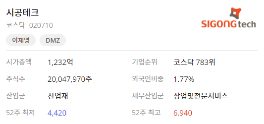 처음은 시공테크(020710)의 기본분류와 기본정보를 알아보겠습니다.