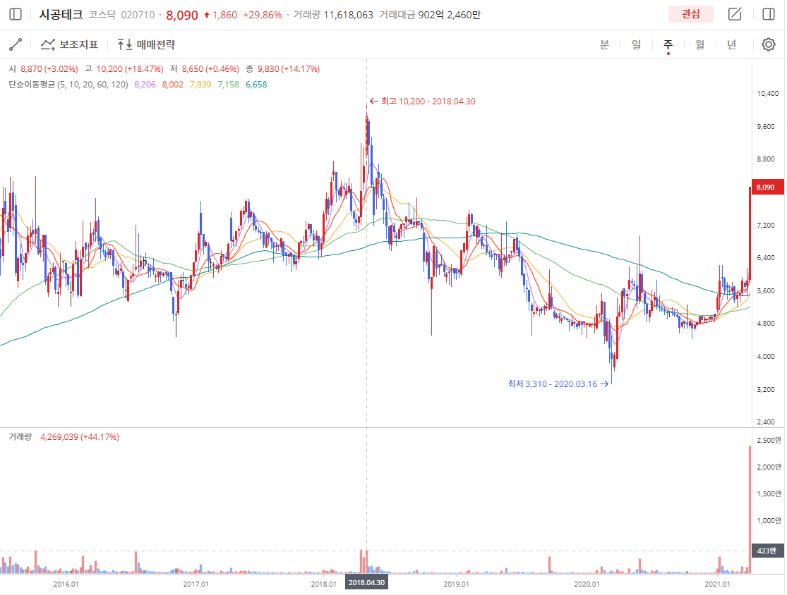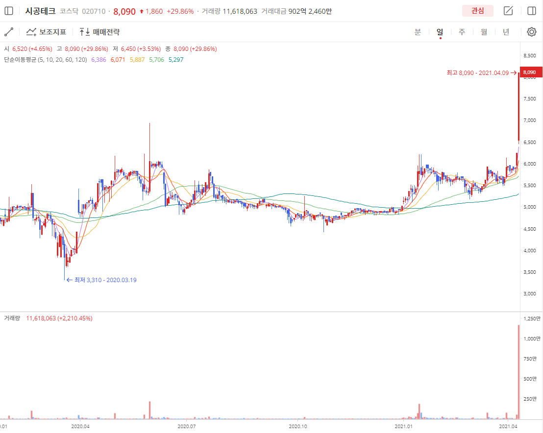 시공테크(020710)주가는 2020년 3월 19일 COVID-19 영향으로 3,310원을 찍고 대략 4,500원을 지지하다가 2021년 4월 9일 상한가를 갔고 종가 8,090원으로 마무리 했습니다.
