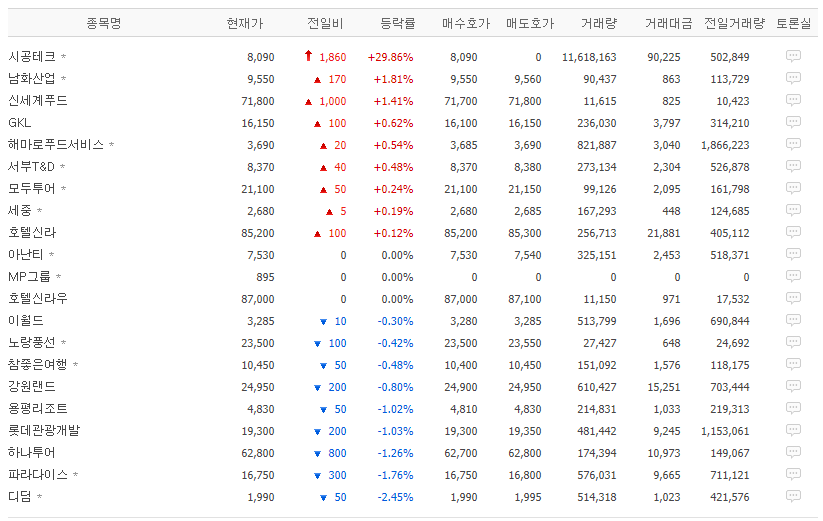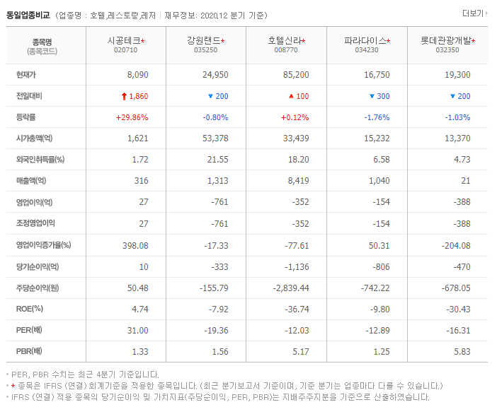 시공테크(020710)의 WICS 분류기준:호텔,레스토랑,레저 기준으로 동일업종비교를 보면 강원랜드035250, 호텔신라008770, 파라디아스034230, 롯데관광개발032350이 먼저 보입니다.