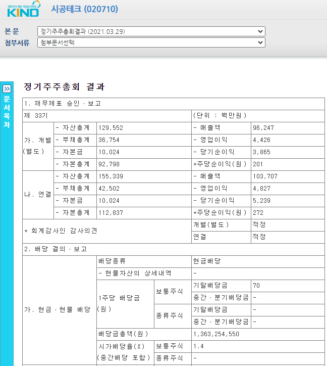 시공테크(020710)의 현금배당수익률이 있어서 배당금 공시를 가져왔습니다.