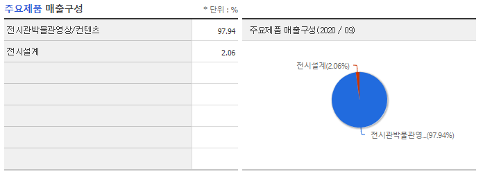 매출 구성은 전시물/전시시설/인터레어:98.00%, 전시 및 인테리어 설계:2.00%입니다.