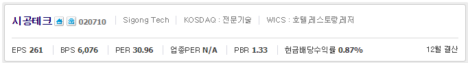 시공테크(020710)는 코스닥:전문기술, WICS:호텔,레스토랑,레저, EPS:261, BPS:6,076, PER:30.96, 업종PER:N/A, PBR:1.33, 현금배당수익률:0.87%, 산업군:, 산업재, 세부산업군:산업및전문서비스입니다.