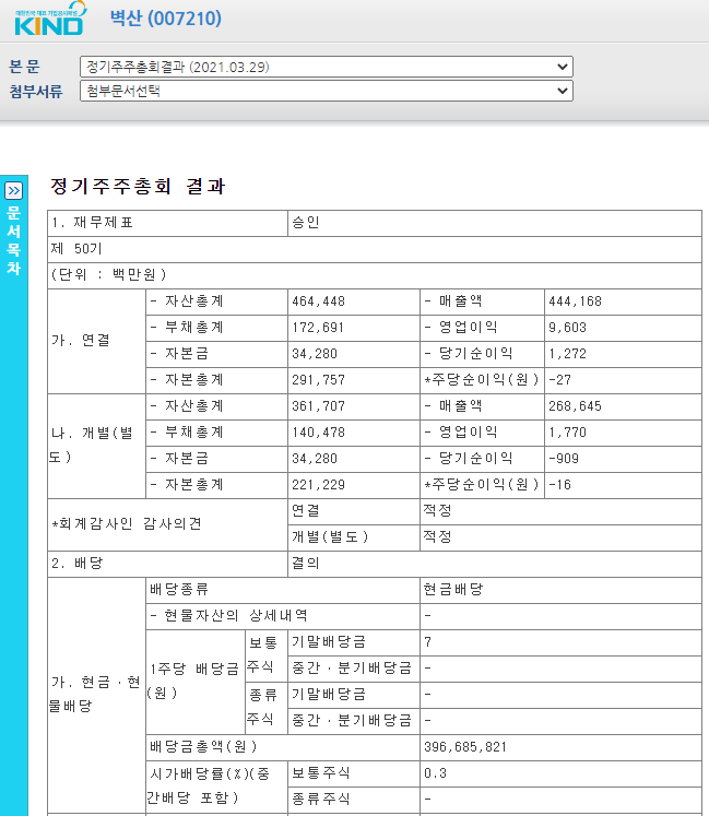 2021년 3월 29일 벽산007210 정기주주총화결과 1주당 배당금은 7원이며 시가배당률은 0.3%입니다.