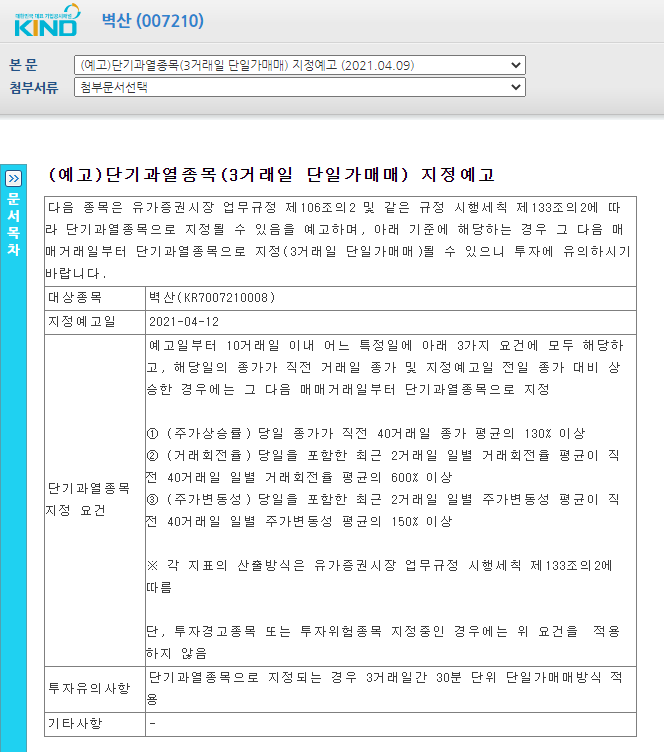 먼저 단기과열종목으로 3거래일 단일가 매매 지정예고 공시가 있습니다.