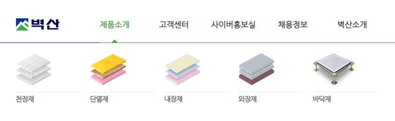벽산007210의 제품군은 5종류로 분류가 되어 있으며 천장채, 단열재, 내장재, 외장재, 바닥재가 있습니다.