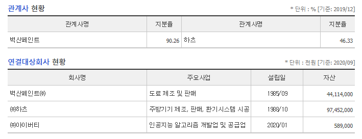 벽산007210의 관계사는 벽산페인트:90.26%이며 하츠:46.33%이며 연결대상회사는 벽산페인트,하츠,아이버티입니다.