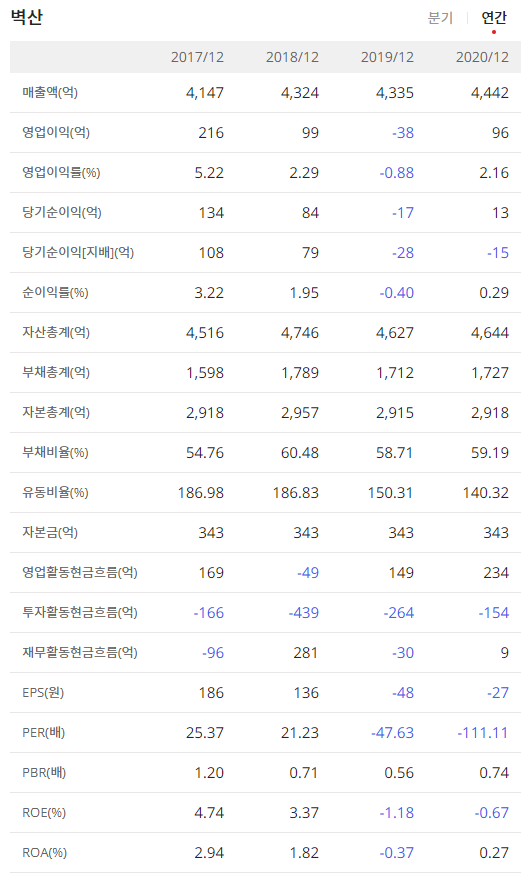 벽산007210의 분기 매출과 연간 매출액을 확인해보겠습니다.