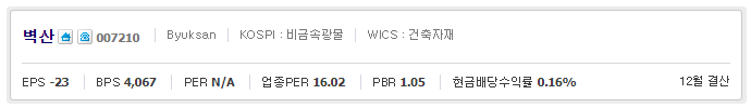 벽산007210 코스피:비금속광물, WICS:건출자재, EPS-23, BPS:4,067, PER:N/A, 업종PER:16.02, PBR:1.05, 현금배당수익률:0.16%, 산업군:산업재, 세부산업군:자본재입니다.