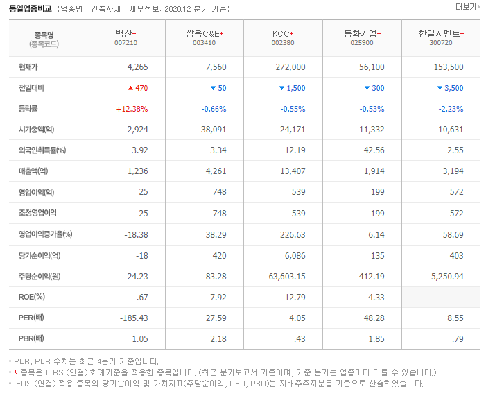 벽산007210의 WICS:건축자재 분류로 동일업종은 쌍용C&E003410(이종목은 쌍용양회에서 사명이 변경되었습니다.), KCC002380, 동화기업025900, 한일시멘트300720가 보입니다.