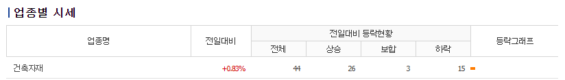 업종별 시세를 보면 건축자재는 전체가 44개의 종목이며 2021년 4월 8일 대비 4월 9일은 +0.83%였습니다.