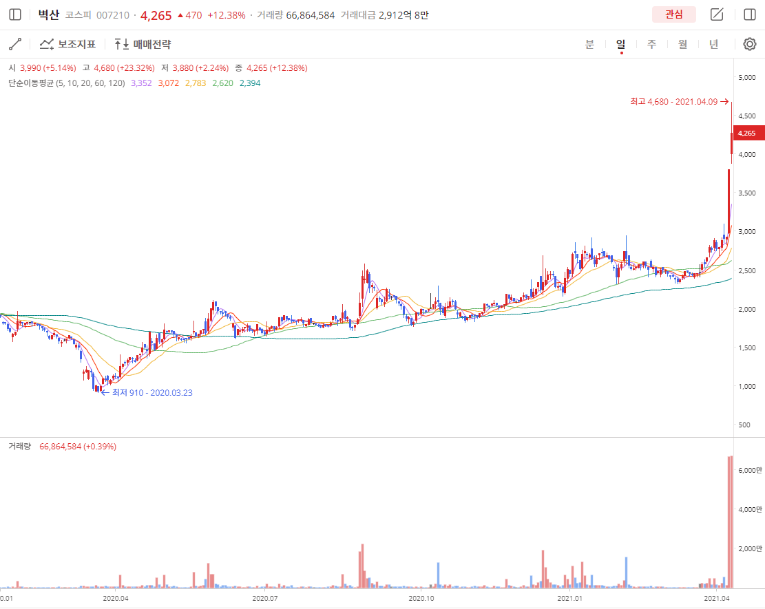 벽산007210도 COVID-19 영향으로 2020년 3월 23일 910원을 찍고 회복해서 2,000원에서 움직이다가 2021년 4월 8일 상한가 그리고 2021년 4월 9일 52주 신고가 4,680원을 찍고 4,265원에 종가로 마무리 했습니다.