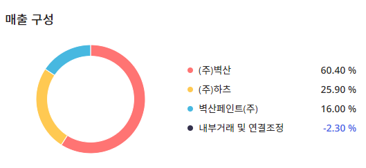 매출구성은 (주)벽산:60.40%, (주)하츠:25.90%, 벽산페인트(주):16.00%, 내부거래 및 연결조정:-2.30%로 구성되어 있습니다.