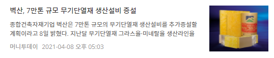 기사 내용을 간단하게 정리하면 벽산은 추가 증설로 그라스울 14만톤, 미네랄울 6만톤의 생산능력을 갖추게 되었으며 무기단열재 시장은 화재 안전이라는 기준을 넘어 그린 리모델링, 제로에너지 시장까지 더욱 폭넓은 영역으로 발전하고 있다는 내용이 있습니다.