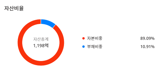 SBI인베스트먼트019550의 자산총계는 1,198억이며 자본비중:89.09%, 부채비중:10.91%입니다.