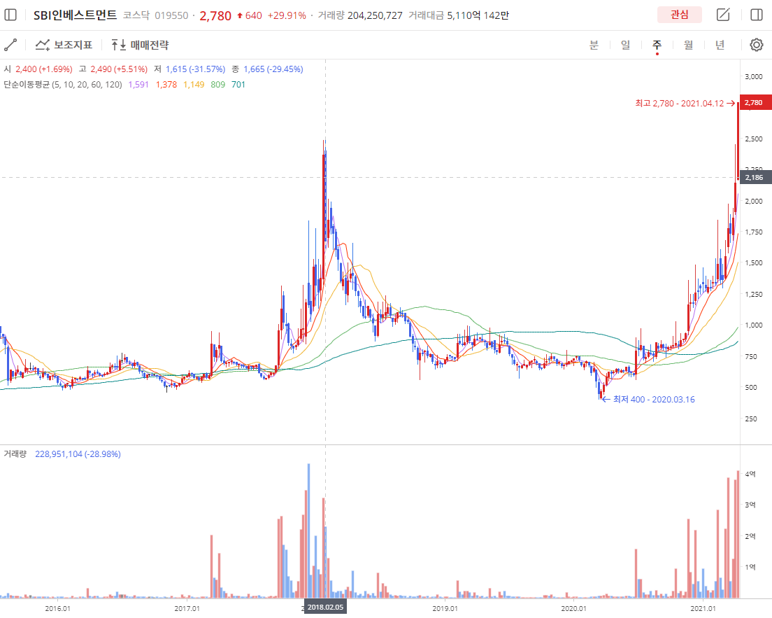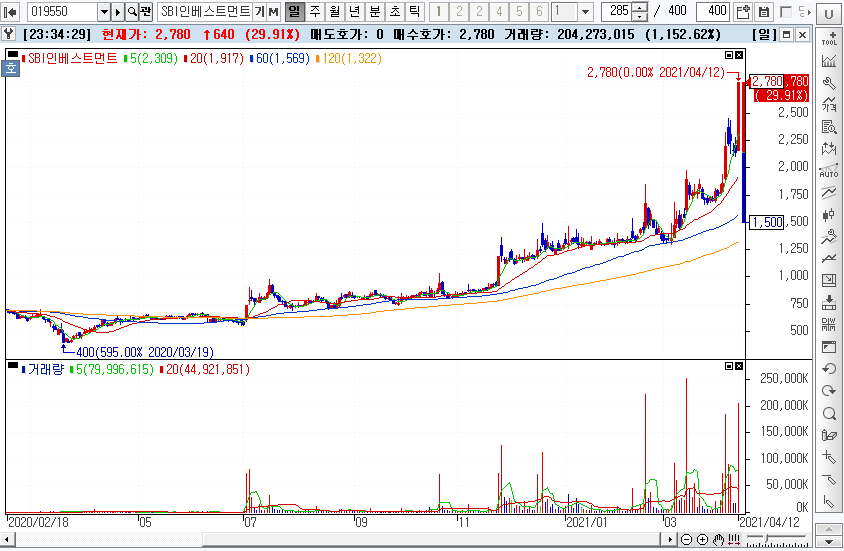 다시 돌아와서 SBI인베스트먼트019550종목은 COVID-19 영향으로 2020년 3월 19일 400원까지 하락하였다가 지속적으로 상승했고 2021년 4월 12일 상한가를 갔으며 4월 12일의 종가는 2,780원 입니다.
