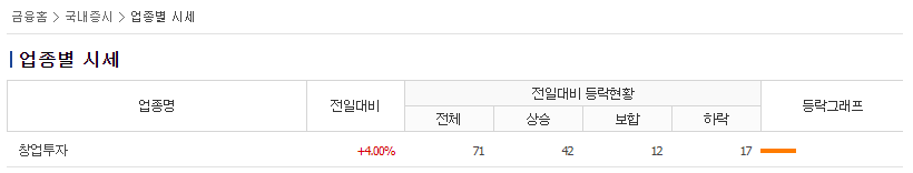 창업투자 기준 동일 업종은 총 71개 종목이 있으며 2021년 4월 9일 대비 +4.00% 상승하였습니다.